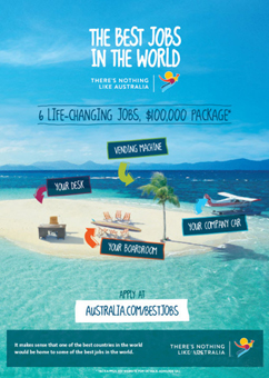 “世界上最好的工作”是澳大利亞旅游局面向全球推廣工作假期簽證計劃的主要組成部分。工作假期簽證為18-30歲的外國公民提供12個月的工作旅行機會,讓年輕的旅客來澳大利亞度過長假,同時從事短期工作以補充旅行費用。(目前該類型簽證并不覆蓋中國大陸地區)澳大利亞旅游局董事總經理Andrew McEvoy表示,該活動將打造一個優質平臺,吸引全世界的年輕人來到澳大利亞。“我們已經打造出了最成功的旅游傳播活動,并將它做得更大更好。借此,澳大利亞將向世界傳播我們令人窒息的風景、獨特的生物群落、美食與美酒,當然還有澳大利亞人的娛樂精神。”