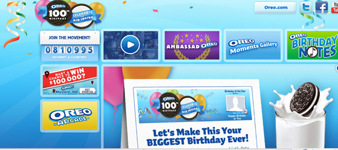 奧利奧100周年慶典首先從平面廣告開始。和一般品牌只強調自己的品牌歷史和文化不同,奧利奧更懂得什么樣的內容更容易打動消費者 - 用一堆奧利奧餅干、牛奶和玻璃杯拼出過去100年的歷史。而且,奧利奧知道什么樣的歷史講述具有讓你目光停留3秒的魔力 。 100年的歷史不過是扭一扭,舔一舔和點一點。這組平面廣告在平面媒體、戶外廣告牌和臉書上發布和傳播,而核心是吸引大家到官方網站www.oreo.com/birthday, 奧利奧的官方網站也沒有落入“送祝福送大獎”的俗套。奧利奧清楚的明白如何把這一品牌的節日變成大眾的節日- 一起分享你心中的童趣。