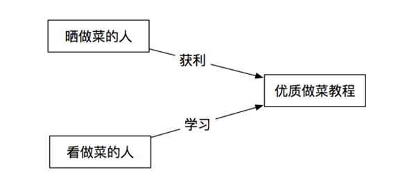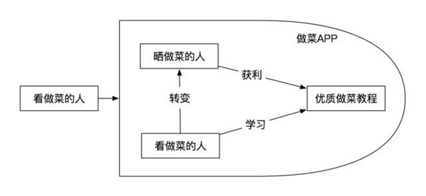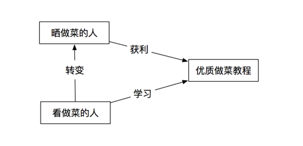 我們可以看到,兩種角色的目的是一致的,那么,根據(jù)前文可以知道,曬怎么做菜的人黏度更大,是相對更為優(yōu)質(zhì)的用戶,那么我們就需要有一個機制讓看怎么做菜的人轉(zhuǎn)變?yōu)闀裨趺醋霾说娜耍瑥亩玫较聢D: