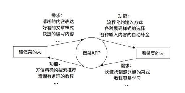 回過頭來看,我們構(gòu)建了產(chǎn)品心智,吸引了目標用戶來嘗試使用我們的產(chǎn)品,我們加強了用戶中各種角色的關(guān)系,讓他們能夠相互之間獲利,提高了一定的用戶黏度。但是,是不是覺得總是少了哪部分的思考?是的,從用戶本身的訴求出發(fā),用戶使用我們產(chǎn)品的目的是什么?還是用我們做菜APP來舉例,不同的用戶在使用APP時,可能會有想要達到的各種不同的目的,這里只闡述做菜APP中的一個最常見目的,用來表述思路。